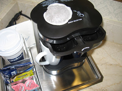 On a silver tray, no less. Of course I find out later that my wife isn’t a fan of the brand’s scents (Crabtree & Evelyn). But they’re free, and you can’t travel with liquids, so you compromise and make due with what they supply, or you bring your own (I bring my own). In fact, I go to great lengths, which some might see as “overboard,” to making sure I’m comfortable when away from home. Which leads to the next experience… we went out to dinner, returned to the room and got everyone to bed. Awakening the next morning, my wife and I were craving some good, strong, Portland-level coffee. To be safe, we’d brought our own coffee from Stumptown Coffee Roasters, in my opinion some of the best coffee in the world (I’ll save micro-roasting for yet another post). Going to the coffee machine, we discovered that Hilton has tried to make the coffee experience easier for guests by installing those coffee pod machines in every room.