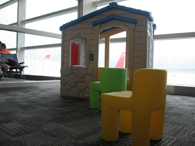 I wish I had a photo from the play area in Salt Lake City. My kids spent an hour picking up Duplo building blocks, filling them with Lincoln Logs, and organizing them in a little Fisher Price playhouse. I don’t know what the organizational process was, but it kept them busy for an hour. And when you’re trying to entertain two kids over a 3 hour layover, this is a great thing. The Portland play structure (first above) obviously has a lot of physical activity to it, and it’s always a good thing to try and get as much energy out of the kids before they’re on a plane for three and a half hours. Even the Detroit one (second above) kept the kids busy for half an hour until we were ready to board the plane… moving chairs in and out of the house, pretending the house was a take-out restaurant…